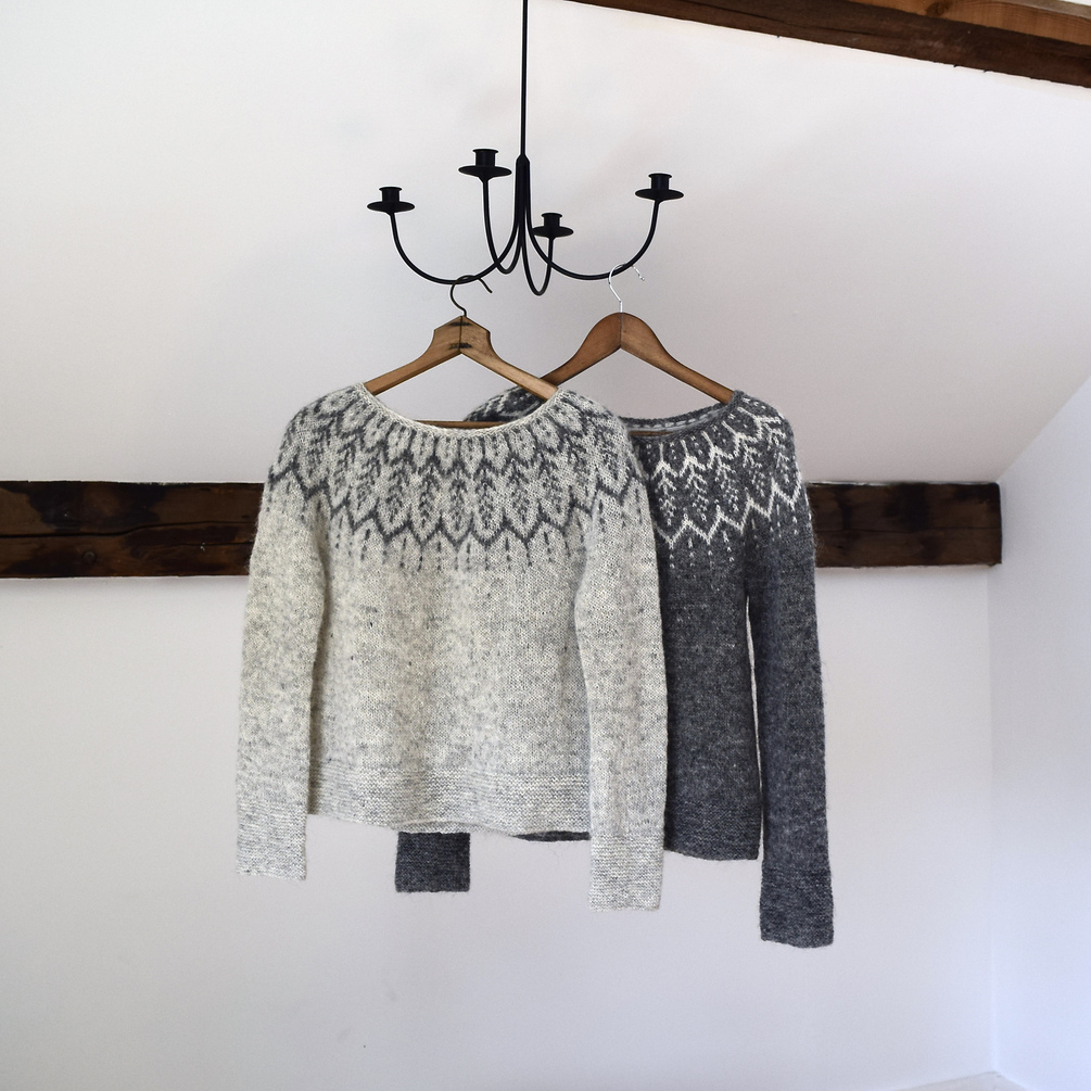 Dark grey sweater: #9102 steel grey (MC), 3 (4, 4, 4, 4)(5, 5, 5, 6, 6) plates; #0001 undyed white (CC), 1 plate for all sizes.