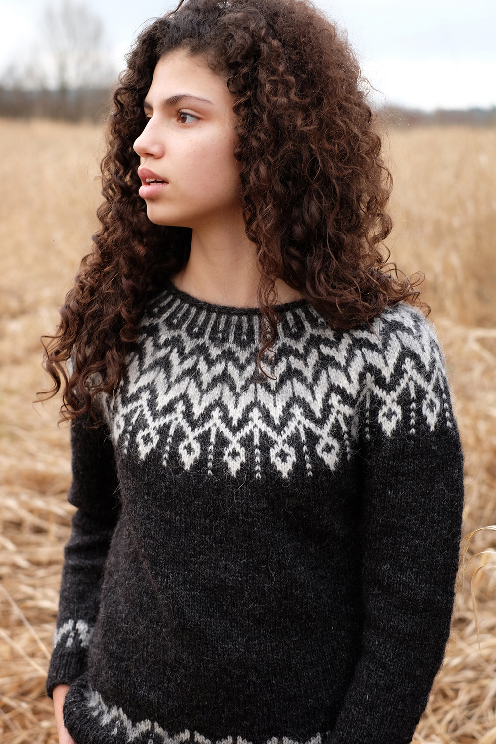Dreyma means dream in Icelandic. This sweater is worked seamlessly from the top down, starting with the option of either a ribbed or rolled neckline. The stranded yoke is worked, short row shaping is added on the back of the sweater to shape the shoulders and neckline. The sleeves and body are separated and worked top down. Optional gentle waist shaping makes for a flattering, feminine fit.