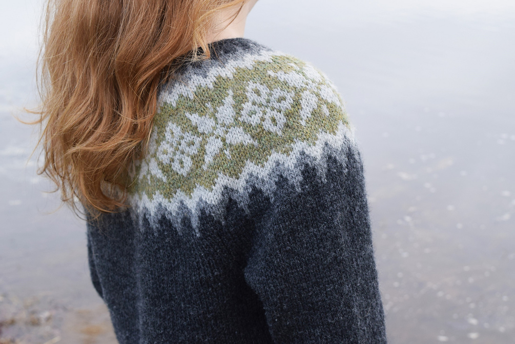 This top down sweater is a modern take on the classic Icelandic lopapeysa. The yoke is first cast on provisionally with waste yarn and long tail cast on. Raglan shaping and short rows are worked for a great fit in the shoulders and the stranded yoke is finished with an applied icord neckline. The body and sleeves are worked top down for a customizable fit. There are no long floats or strands, which makes this sweater a great first stranded yoke project. Instructions for holding two strands of yarn for optimal color dominance are included.