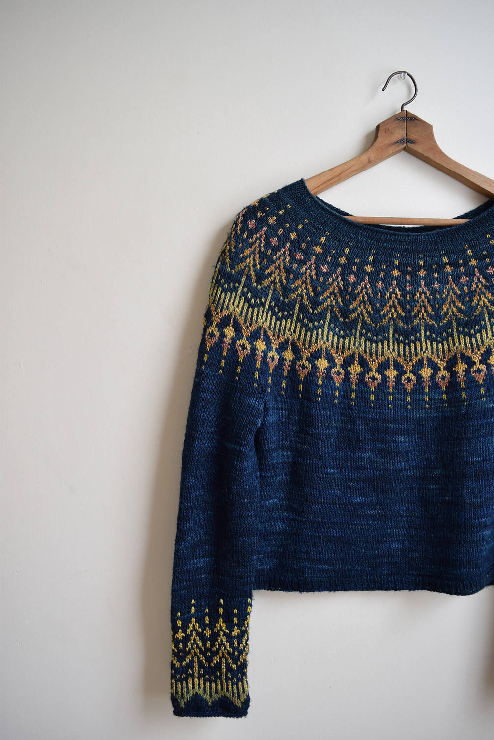This sweater starts at the neckline and is worked seamlessly, top down, and in the round. Short rows are worked to shape the neckline. Next, the colorwork yoke is knit. The body and sleeves are then separated- stitches for the sleeves are transferred to spare needles or waste yarn and underarm stitches are cast on. The body is worked on one circular needle and finished with a ribbed hem. Sleeve stitches are then transferred to knitting needles, the underarm stitches are picked up, and the sleeve is knit top to bottom, finishing with fun colorwork motifs and a rolled cuff.