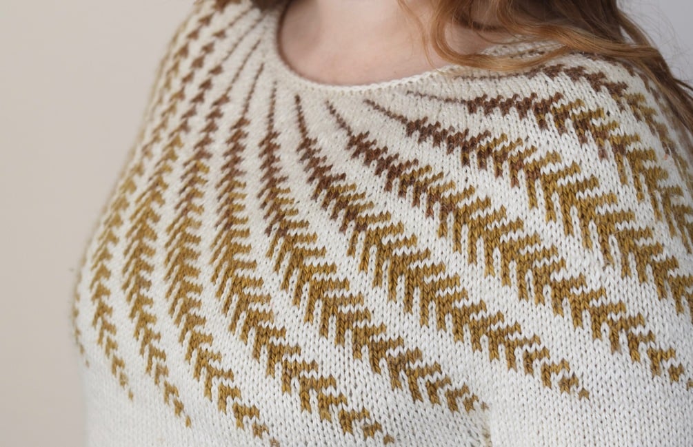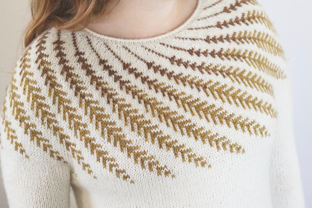 This circular yoke sweater takes a surprising twist with diagonal colorwork cascading down from the neckline. Enjoy simple, engaging, and meditative knitting as the branches swirl around the yoke as you work. I used 2 shades that are similar in both color and darkness, for a smooth transition through the colorwork. Your color choices can change the theme of this design entirely - I see pine boughs, feathers, golden grain, or a windblown, sunlit meadow. DK or worsted weight yarn are suitable for this pattern. The yoke is beginner friendly with memorizable motifs and top down, seamless construction makes it easy to try on this sweater as you knit.
