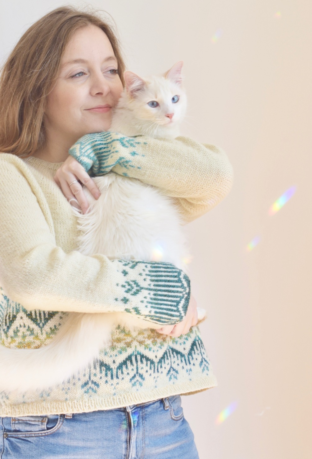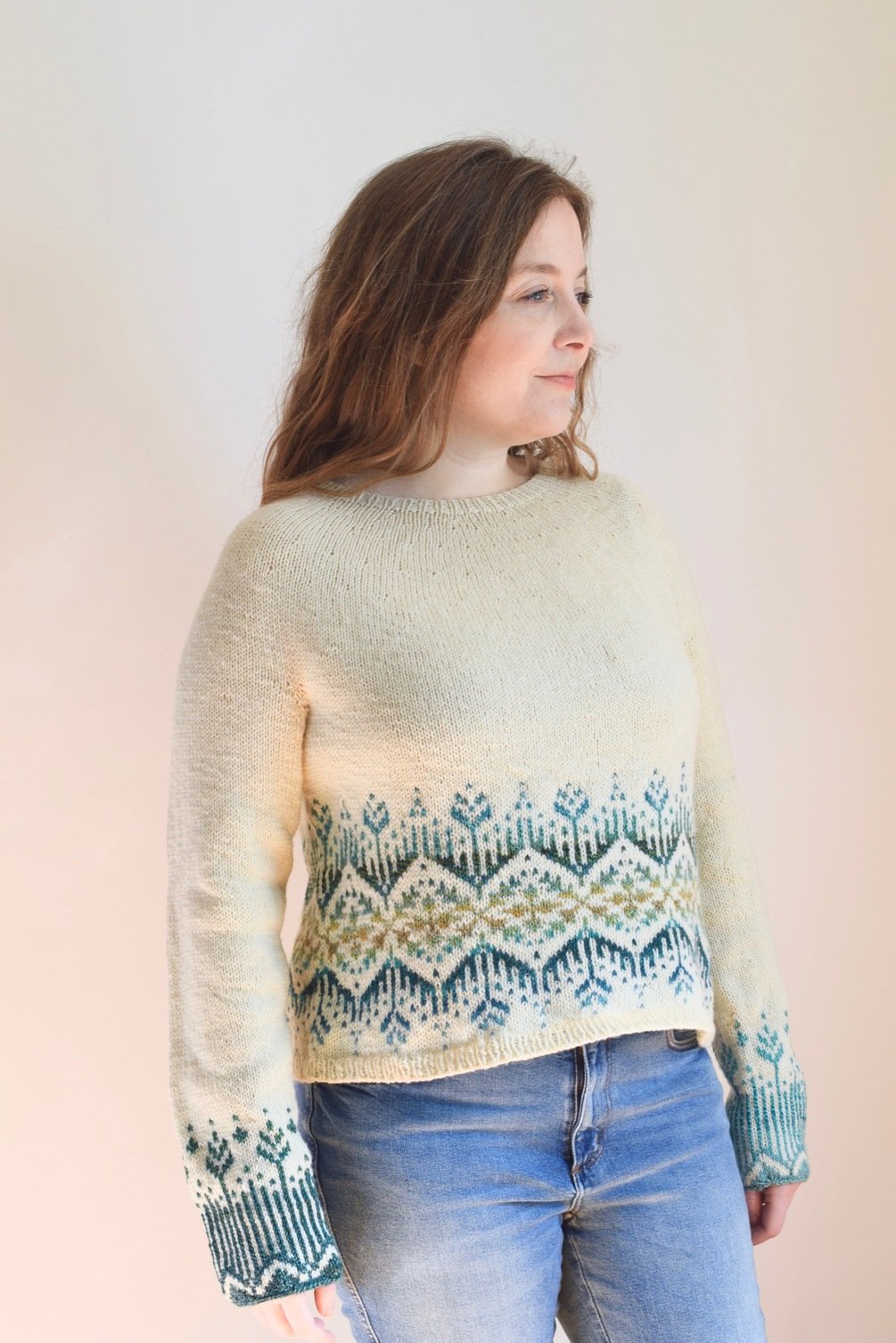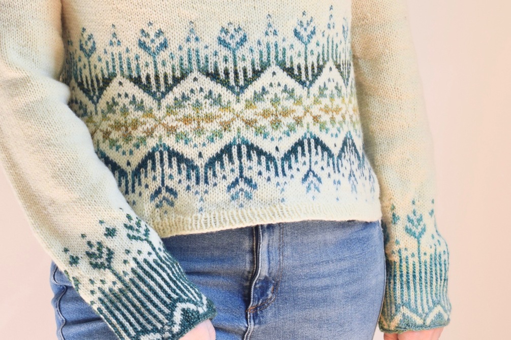 Forest Light is a seamless, top down, circular yoke sweater with colorwork details on the body and cuffs. This design is inspired by a sunny, spring morning in the woods. Knit from the top down, you can try on this sweater while it’s in progress for your best fit. This yoke is very easy to knit. It includes a bit of raglan shaping before the body and sleeve separation, to make for a good fit in the shoulders. If you’re looking for a first colorwork sweater, Forest Light is an approachable pattern. There is no shaping within the colorwork, making this pattern slightly easier than a top down stranded yoke. I used a gradient for my version, yet this design also lends itself well to a single contrasting color. You can also create your own gradient using a few colors of solid colored yarn.