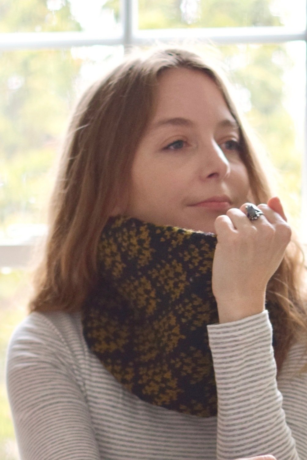 This design is inspired by a fern filled forest. This loop cowl is knit in the round lengthwise. Once the desired length of the cowl has been reached, the two ends of the cowl are joined together with Kitchener stitch (link to tutorial included) to form a continuous, double-sided loop. This is an easy colorwork project and an approachable intro for those who are new to stranded knitting. I love loop cowls because they go on with out any fuss, and fit well underneath a warm winter jacket.